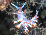 今日のコメント最近中層かっ飛びばかりでしたが今日は少し透明度が落ちたので久々にじっくり小物探し。じっと岩壁を見ていると色んな生物が見えてくる。30p四方のスペースに数え切れない程の生物が生きているんだね。このウミウシもそんな宝物のひとつ。(ゆ) |