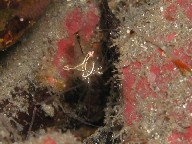 今日のコメント風は冷たいけどお天気も透明度もいいから贅沢言っちゃいけません。今晩は放射冷却で冷え込むでしょうから、皆さん暖かくして寝ましょうね。風邪なんかひいたら潜りに来られないですよ。どう撮っても判りづらいこのカニですが何とか判るかな?(雅臣) |