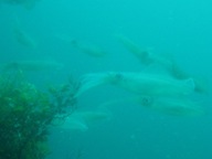 今日のコメントエントリー直後にボラの大群(通称ボラクーダ)に遭遇しました。毎年春と秋に凄い数の群が沿岸を回遊するのですが、これは産卵のためと言われます。富戸の漁師さんに依れば春ボラは卵を持っていないので水面近くを泳ぎ、秋ボラは逆だそうです。(雅) |